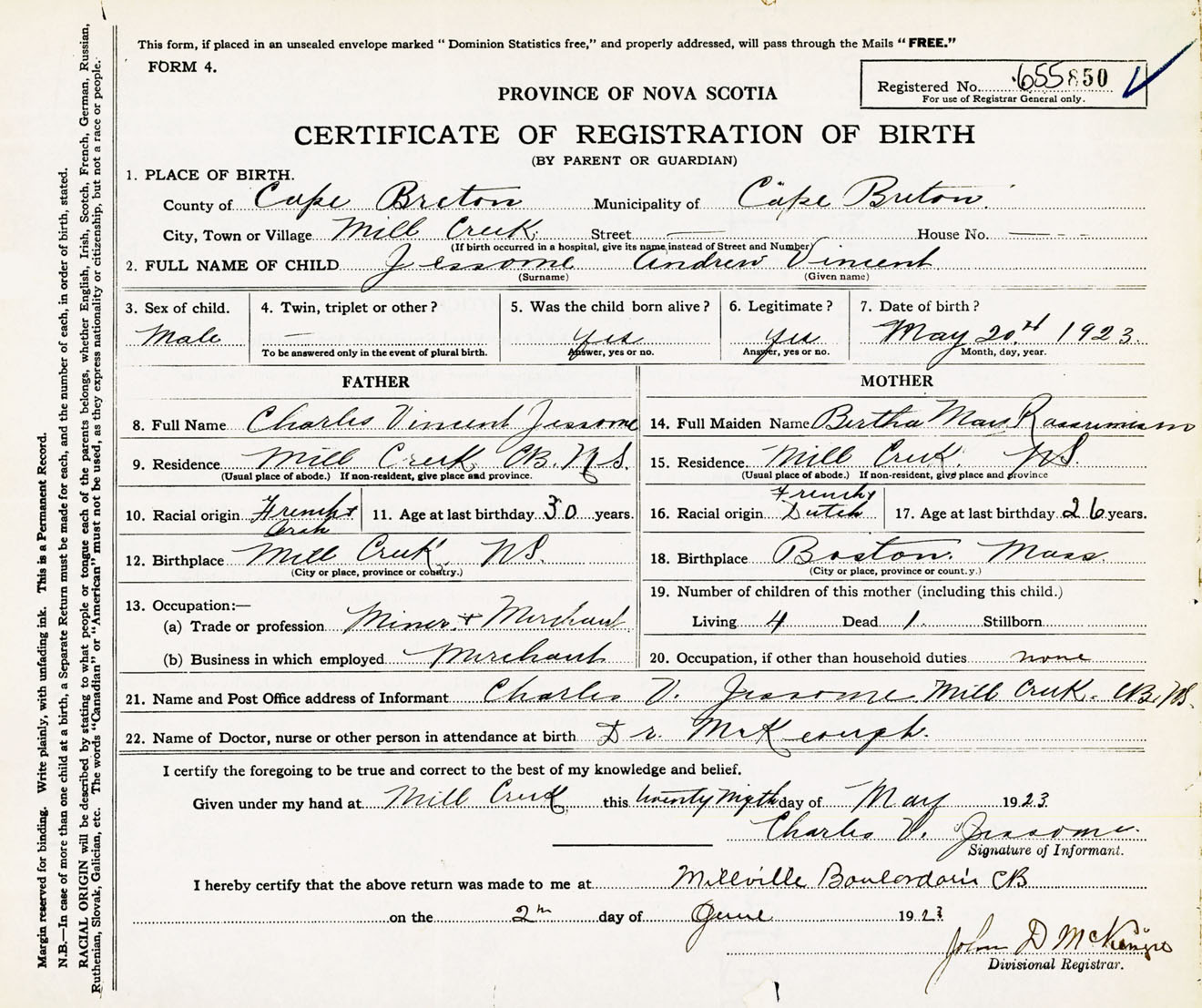 Male Birth Registration: Year: 1923 number: 65500850