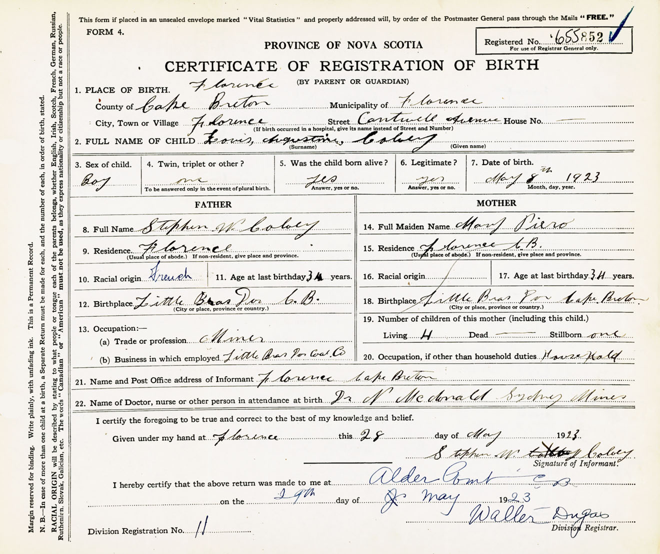 Male Birth Registration: Year: 1923 number: 65500852