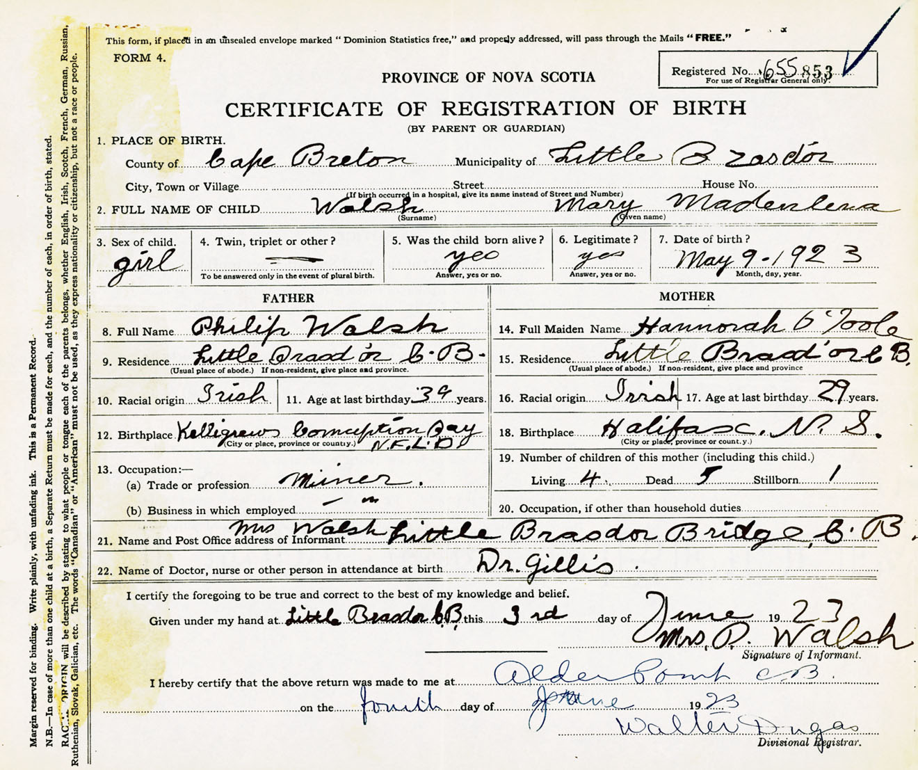 Female Birth Registration: Year: 1923 number: 65500853