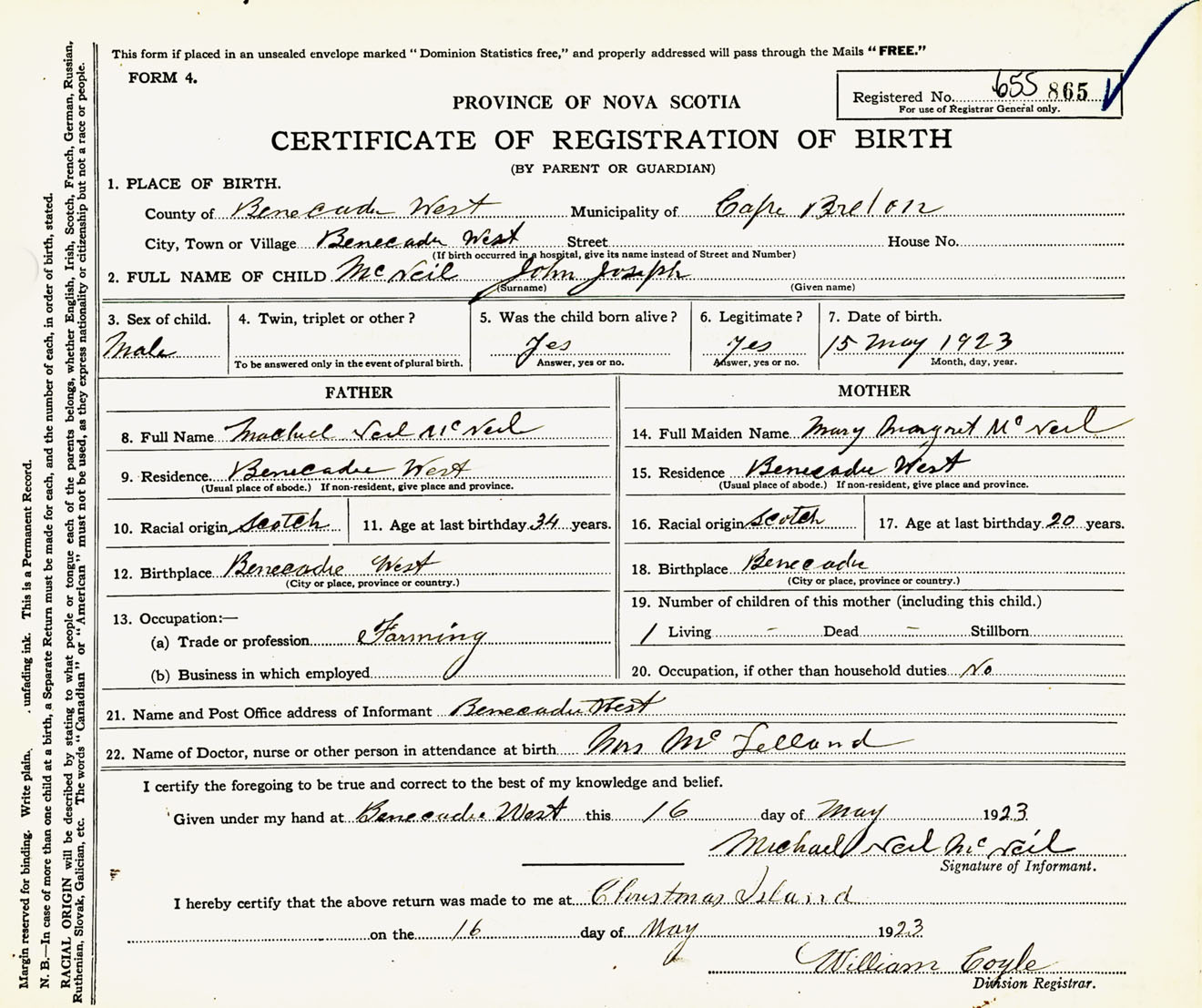 Male Birth Registration: Year: 1923 number: 65500865