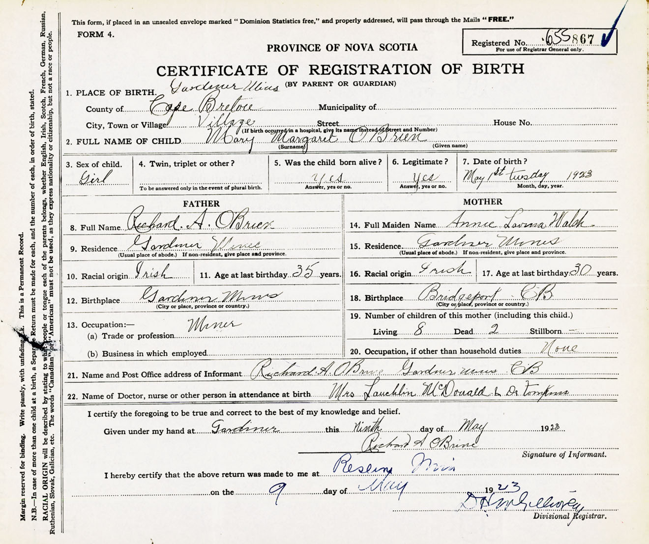 Female Birth Registration: Year: 1923 number: 65500867