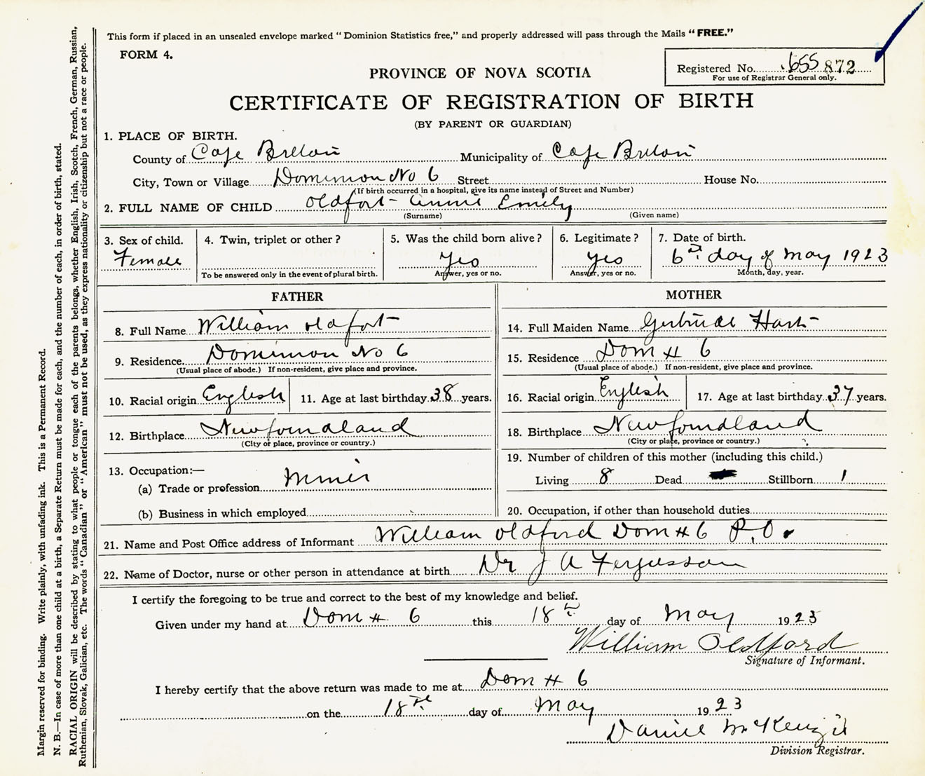 Female Birth Registration: Year: 1923 number: 65500872
