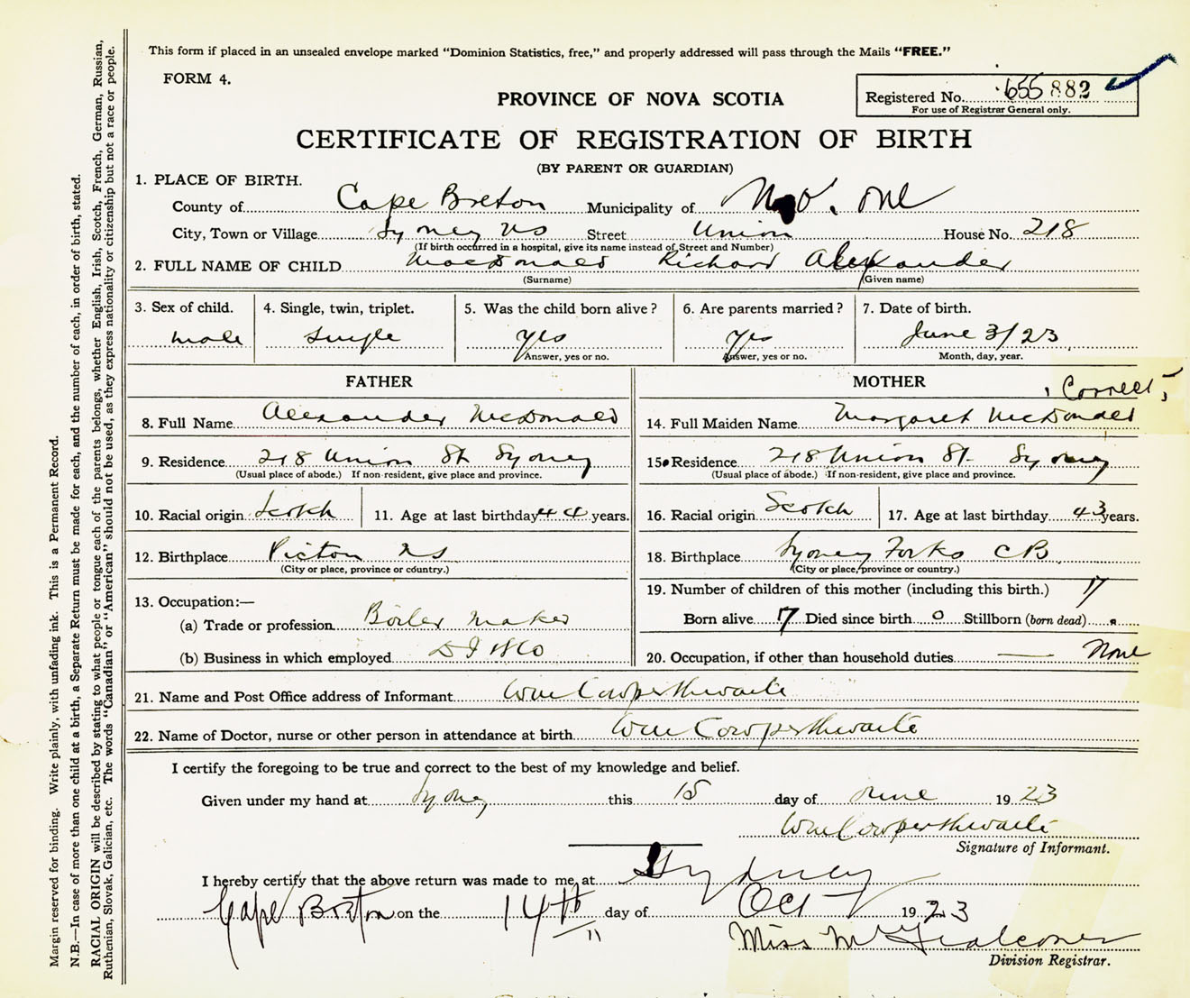 Male Birth Registration: Year: 1923 number: 65500882