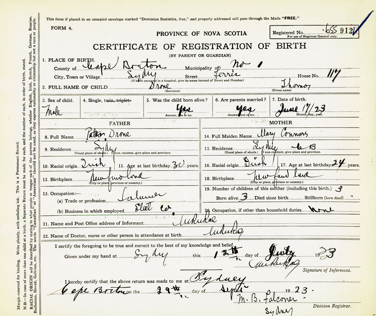 Male Birth Registration: Year: 1923 number: 65500912