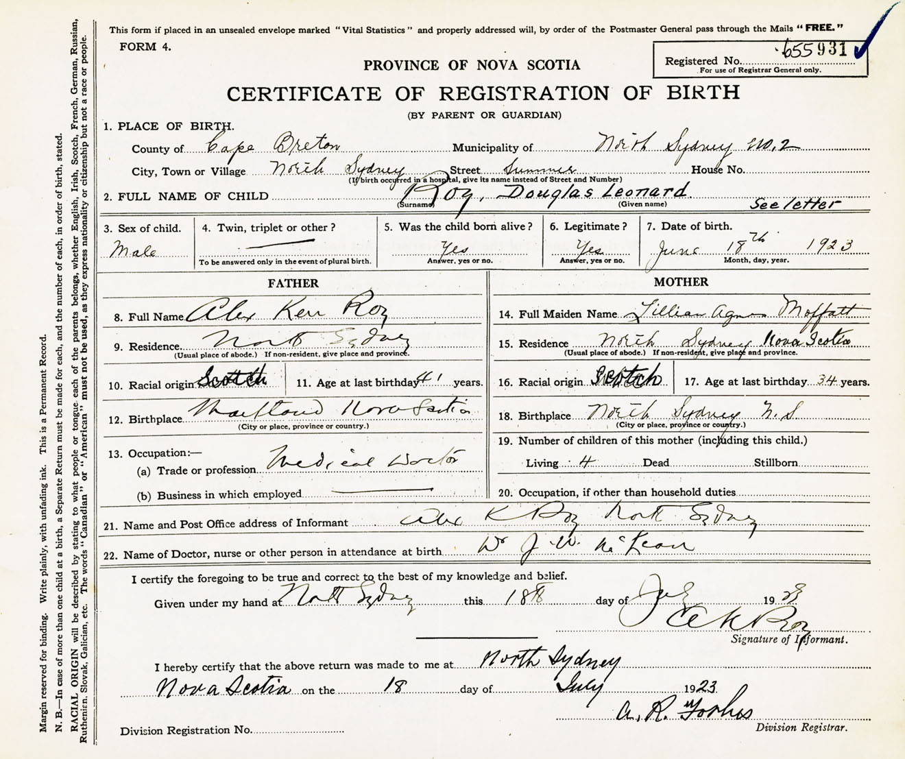 Male Birth Registration: Year: 1923 number: 65500931