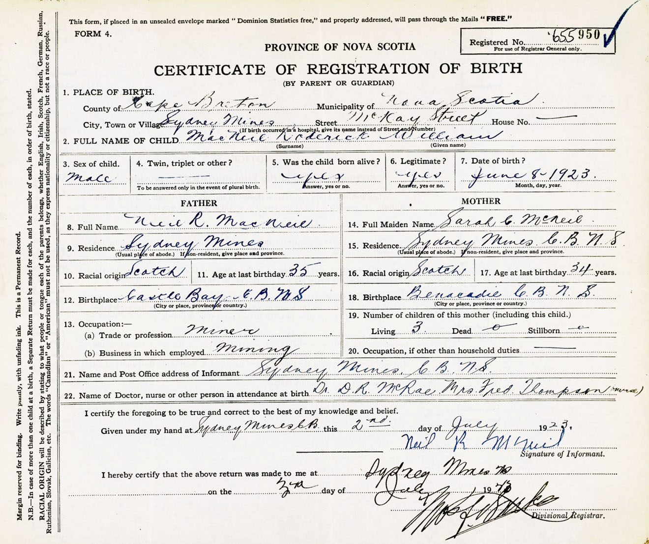 Male Birth Registration: Year: 1923 number: 65500950