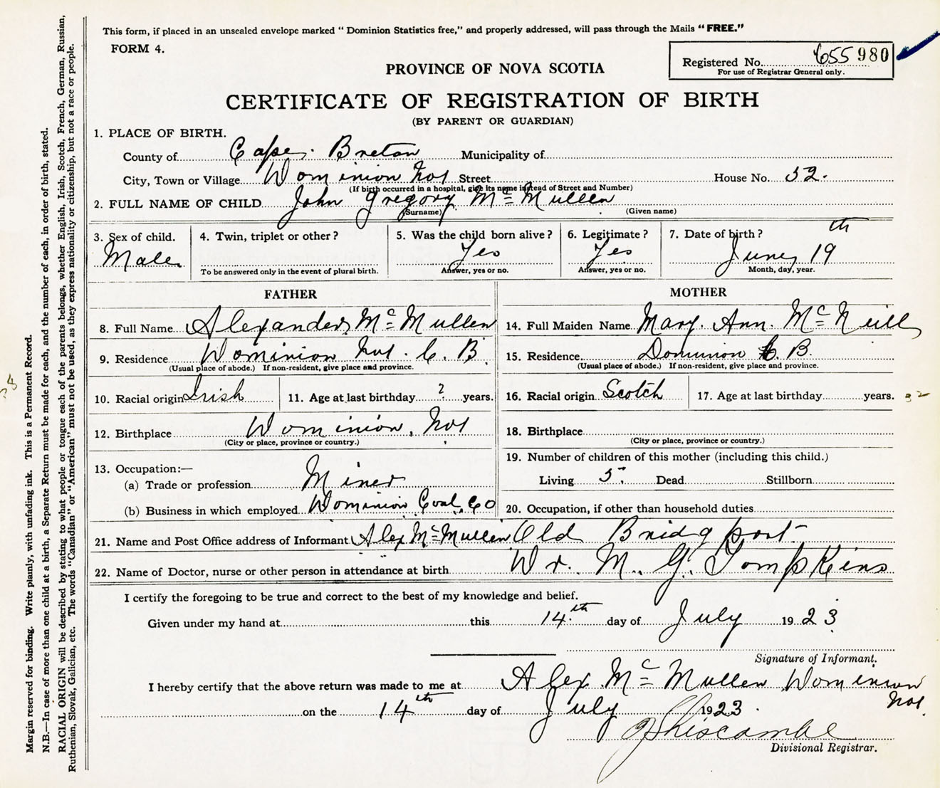 Male Birth Registration: Year: 1923 number: 65500980