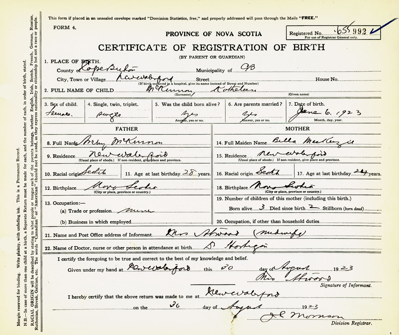 Female Birth Registration: Year: 1923 number: 65500992