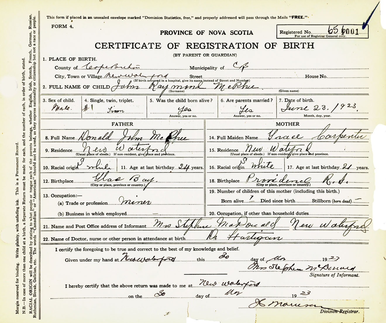 Male Birth Registration: Year: 1923 number: 65600001
