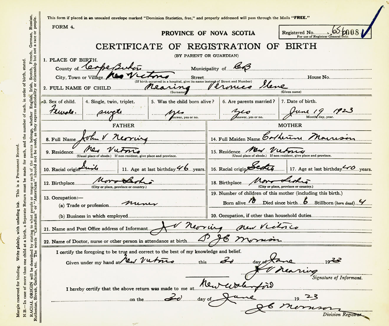 Female Birth Registration: Year: 1923 number: 65600008