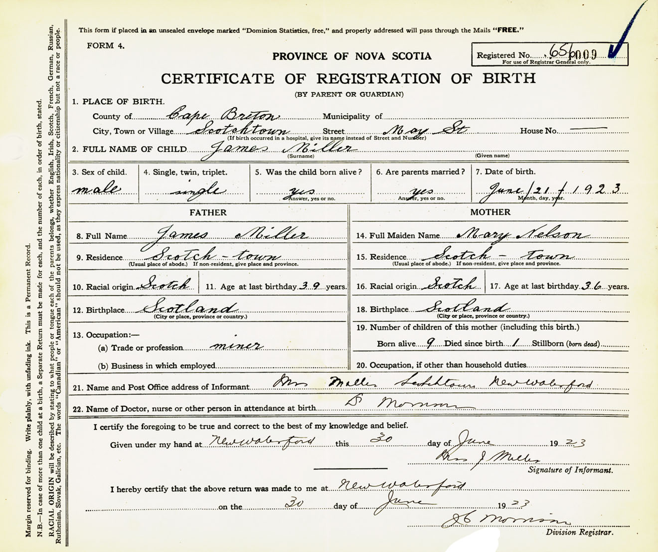Male Birth Registration: Year: 1923 number: 65600009