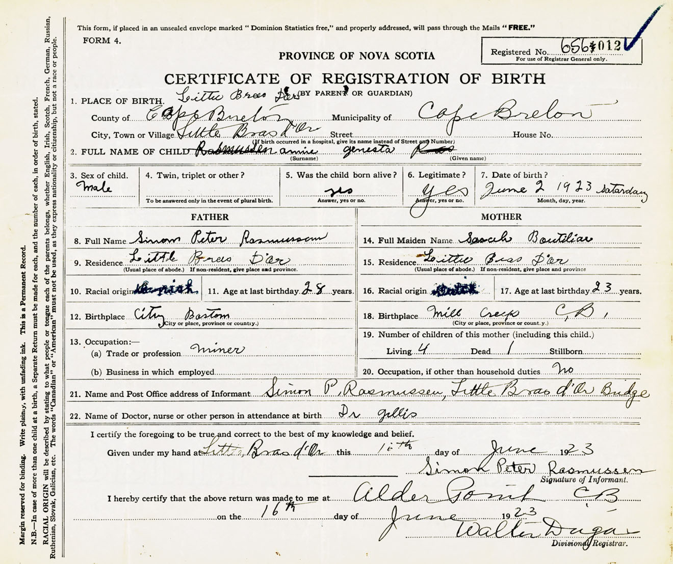 Male Birth Registration: Year: 1923 number: 65600012