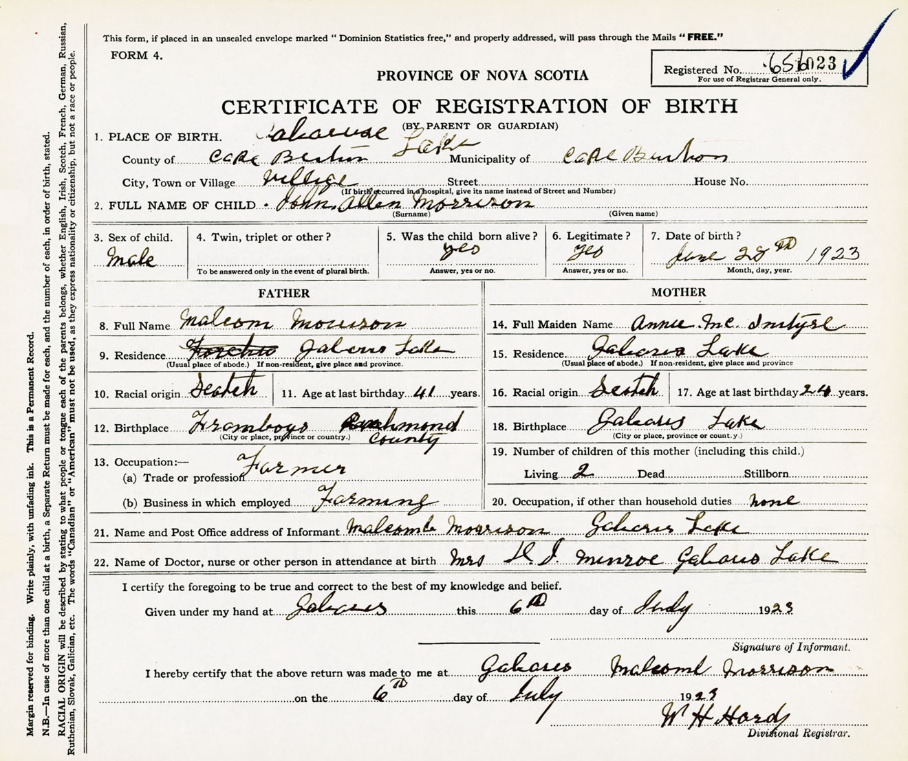 Male Birth Registration: Year: 1923 number: 65600023