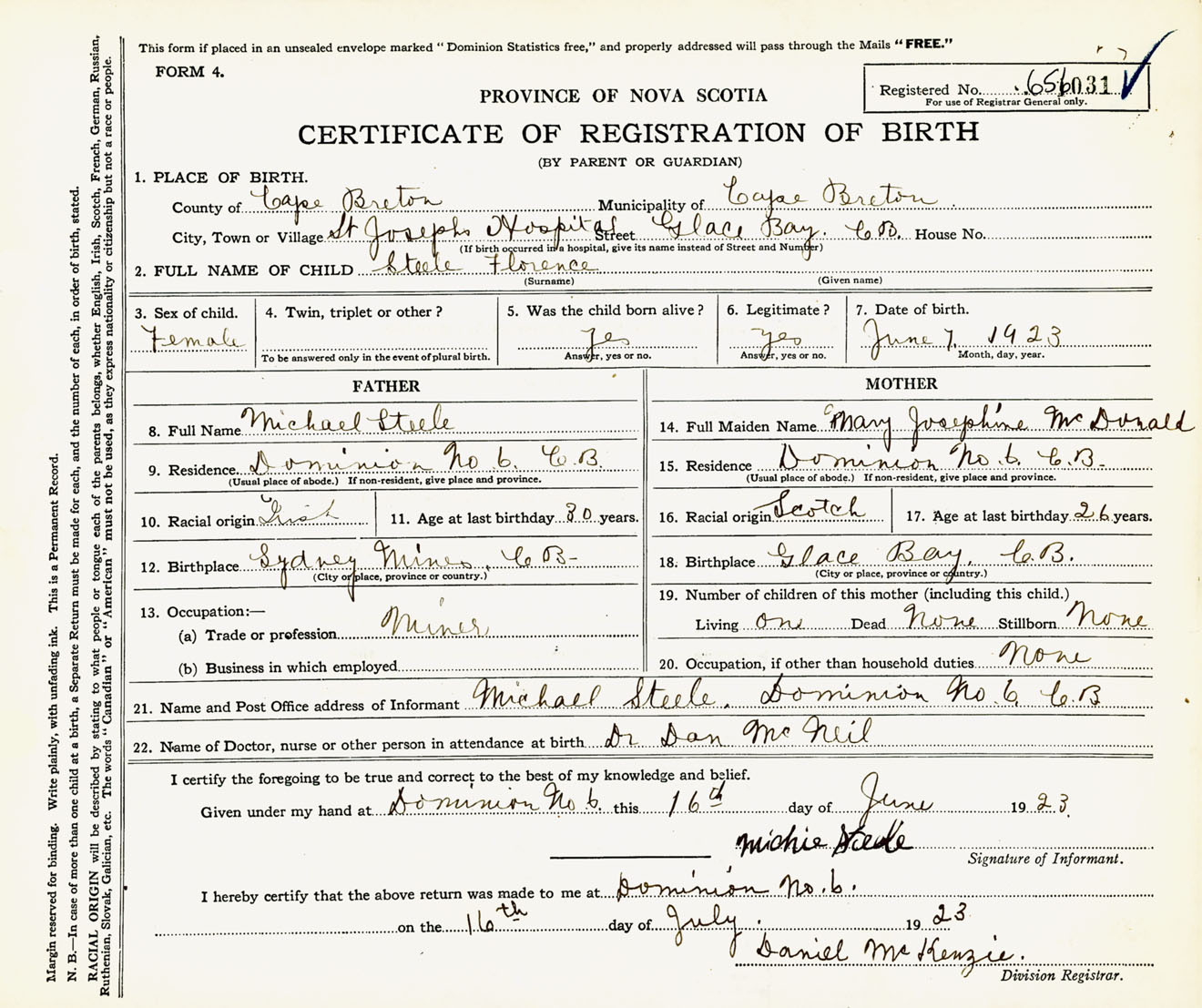 Female Birth Registration: Year: 1923 number: 65600031