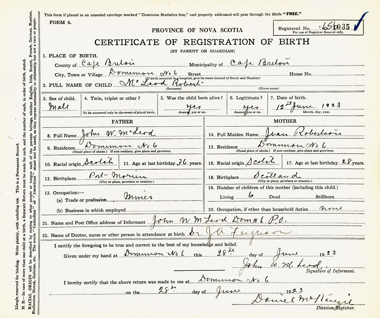 Male Birth Registration: Year: 1923 number: 65600035