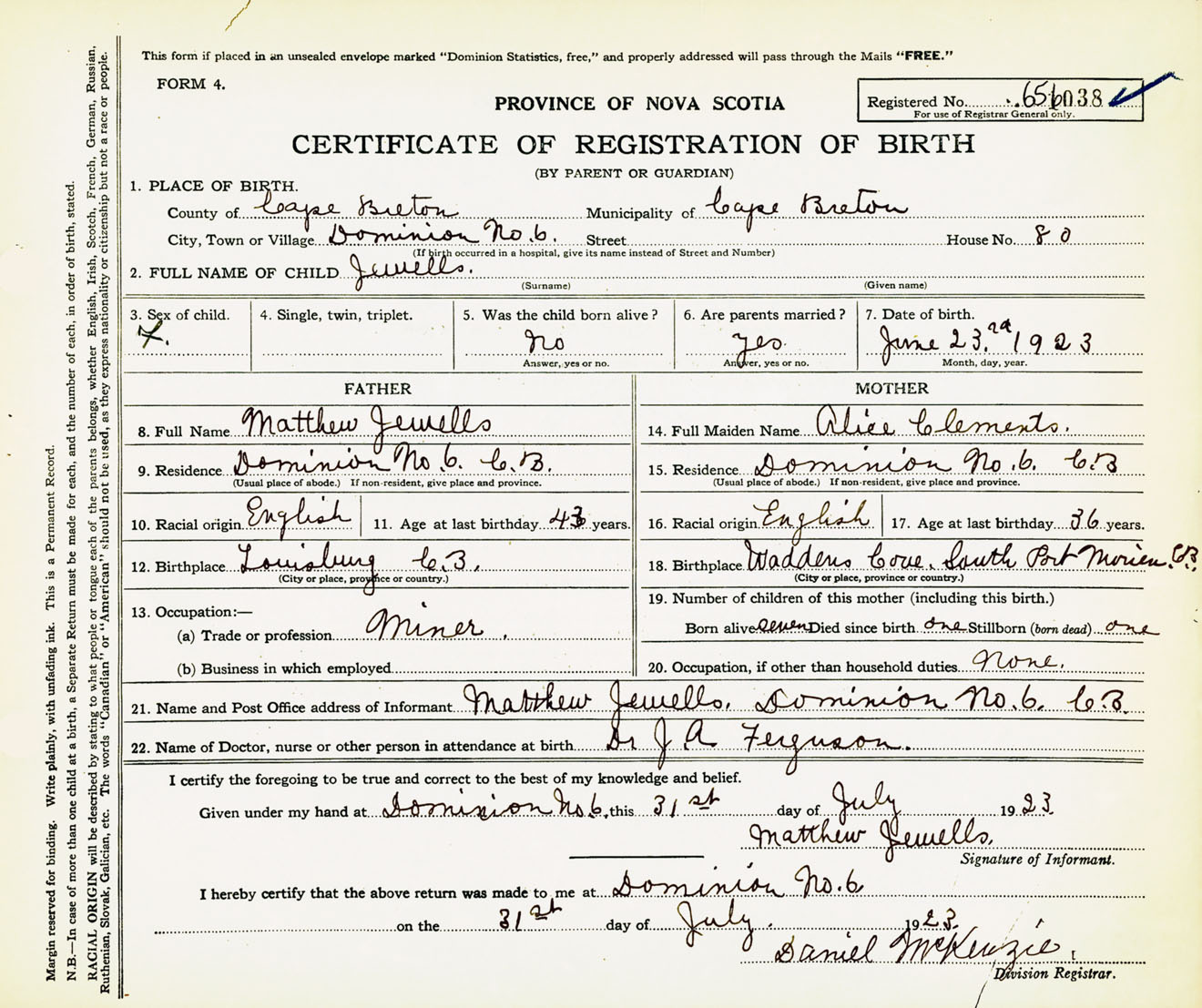Female Birth Registration: Year: 1923 number: 65600038