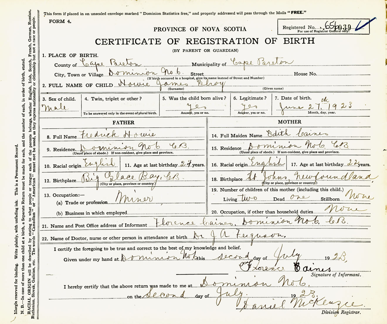 Male Birth Registration: Year: 1923 number: 65600039
