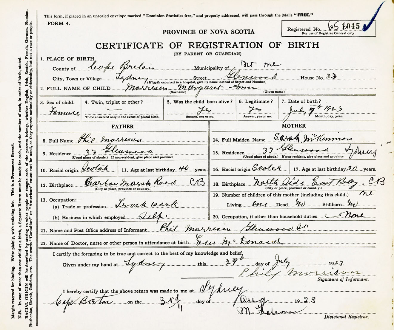 Female Birth Registration: Year: 1923 number: 65600045