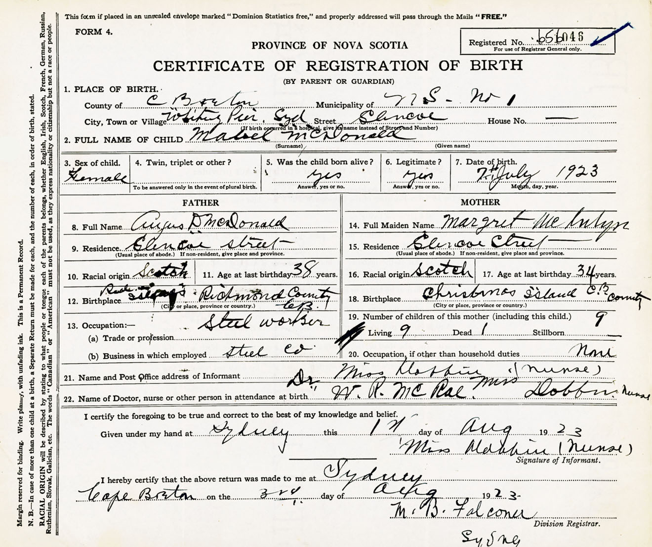 Female Birth Registration: Year: 1923 number: 65600046