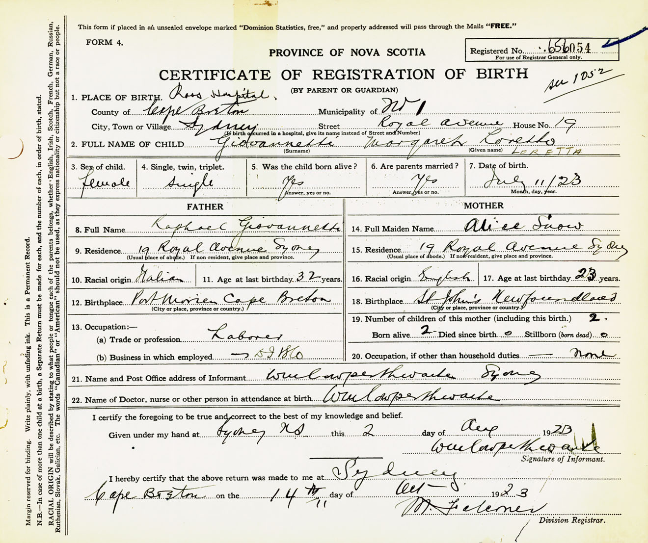 Female Birth Registration: Year: 1923 number: 65600054