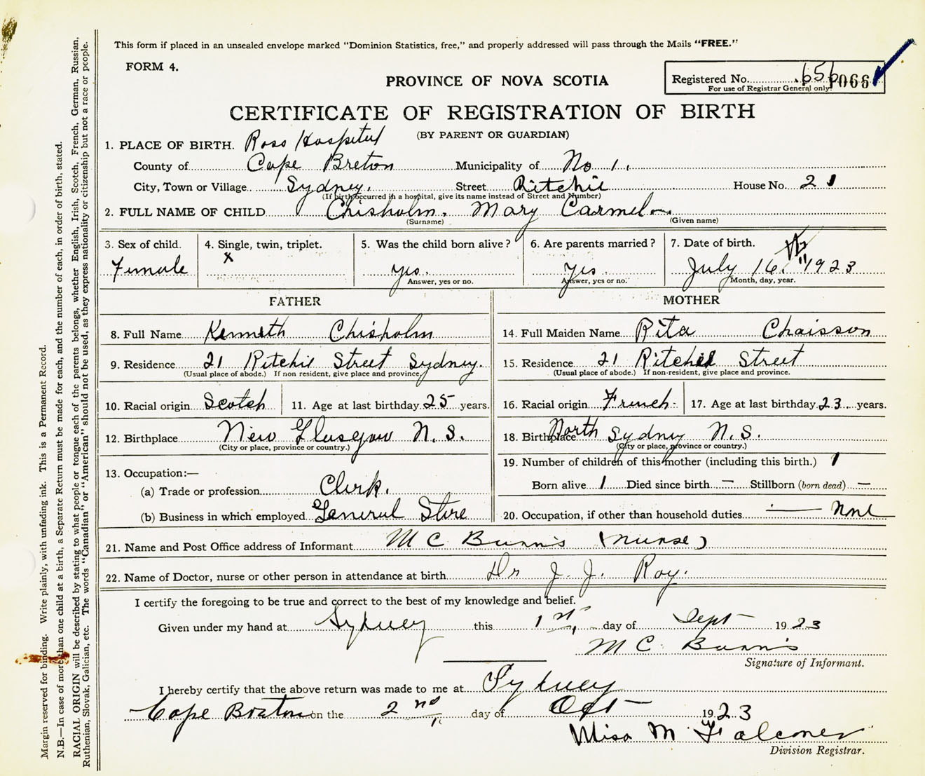 Female Birth Registration: Year: 1923 number: 65600066