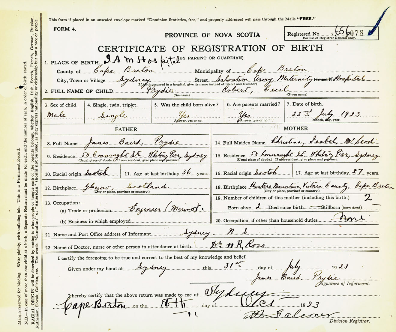 Male Birth Registration: Year: 1923 number: 65600078