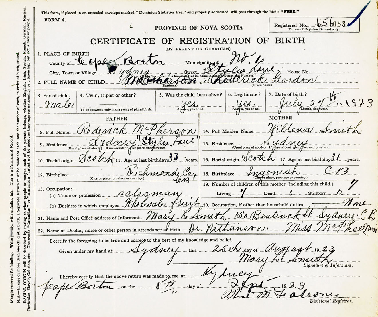 Male Birth Registration: Year: 1923 number: 65600083