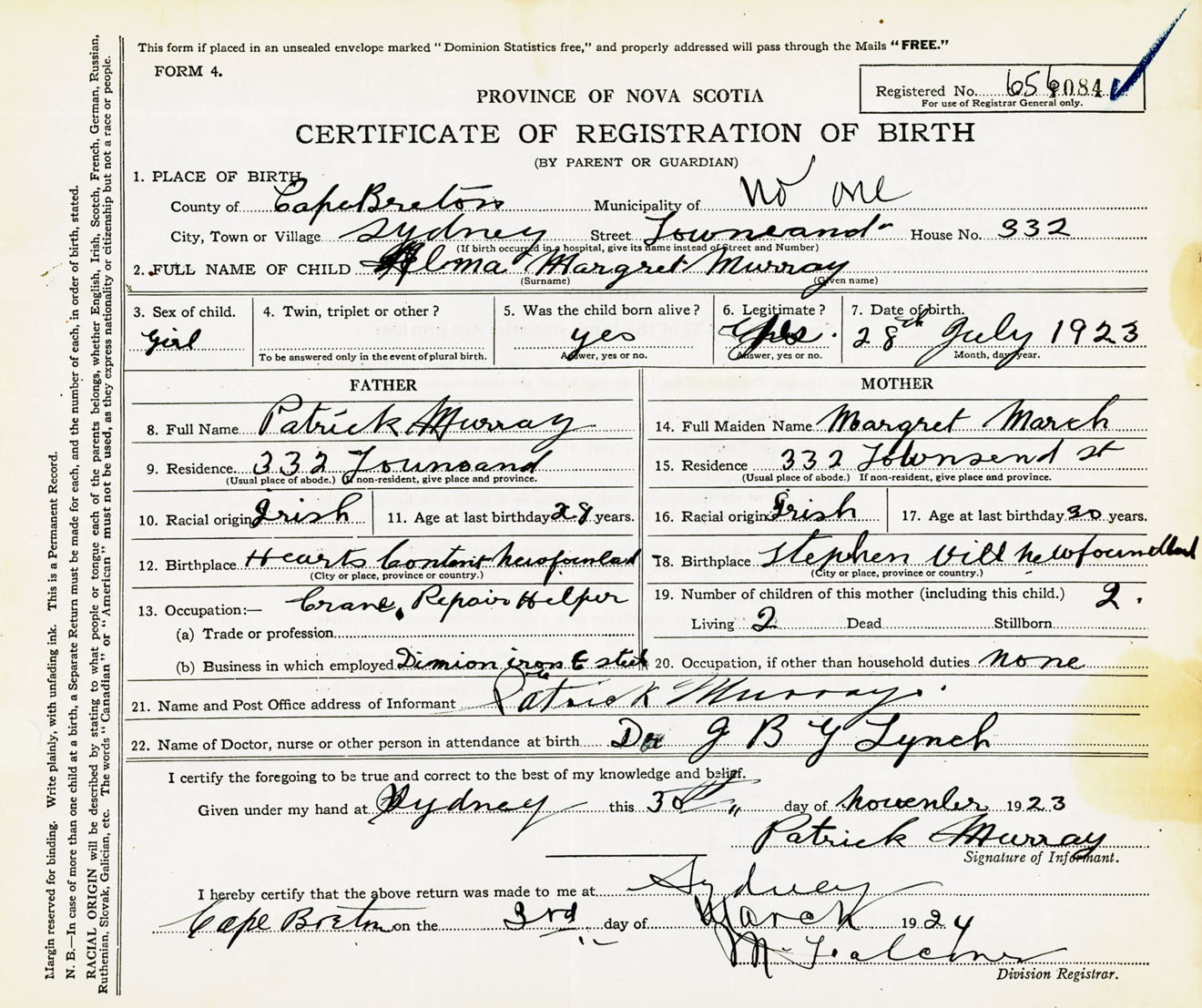 Female Birth Registration: Year: 1923 number: 65600084