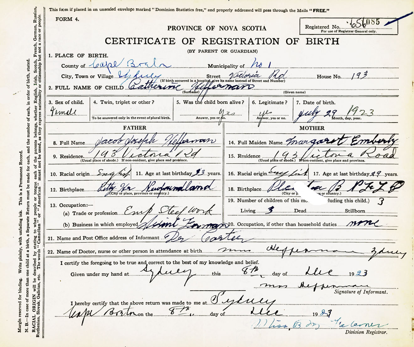 Female Birth Registration: Year: 1923 number: 65600085