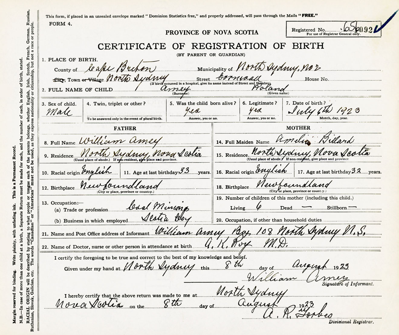 Male Birth Registration: Year: 1923 number: 65600092
