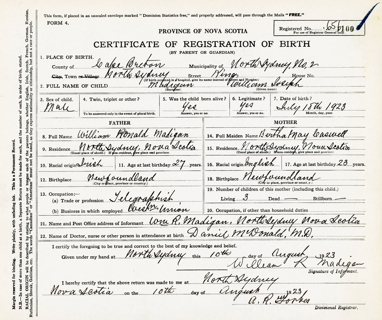 Male Birth Registration: Year: 1923 number: 65600100