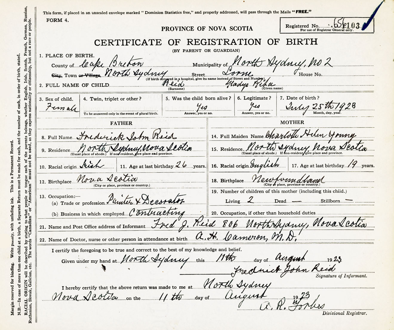Female Birth Registration: Year: 1923 number: 65600103