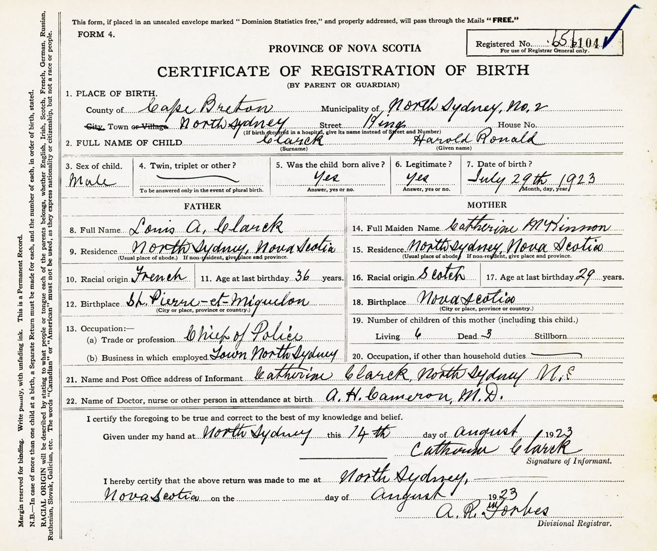 Male Birth Registration: Year: 1923 number: 65600104