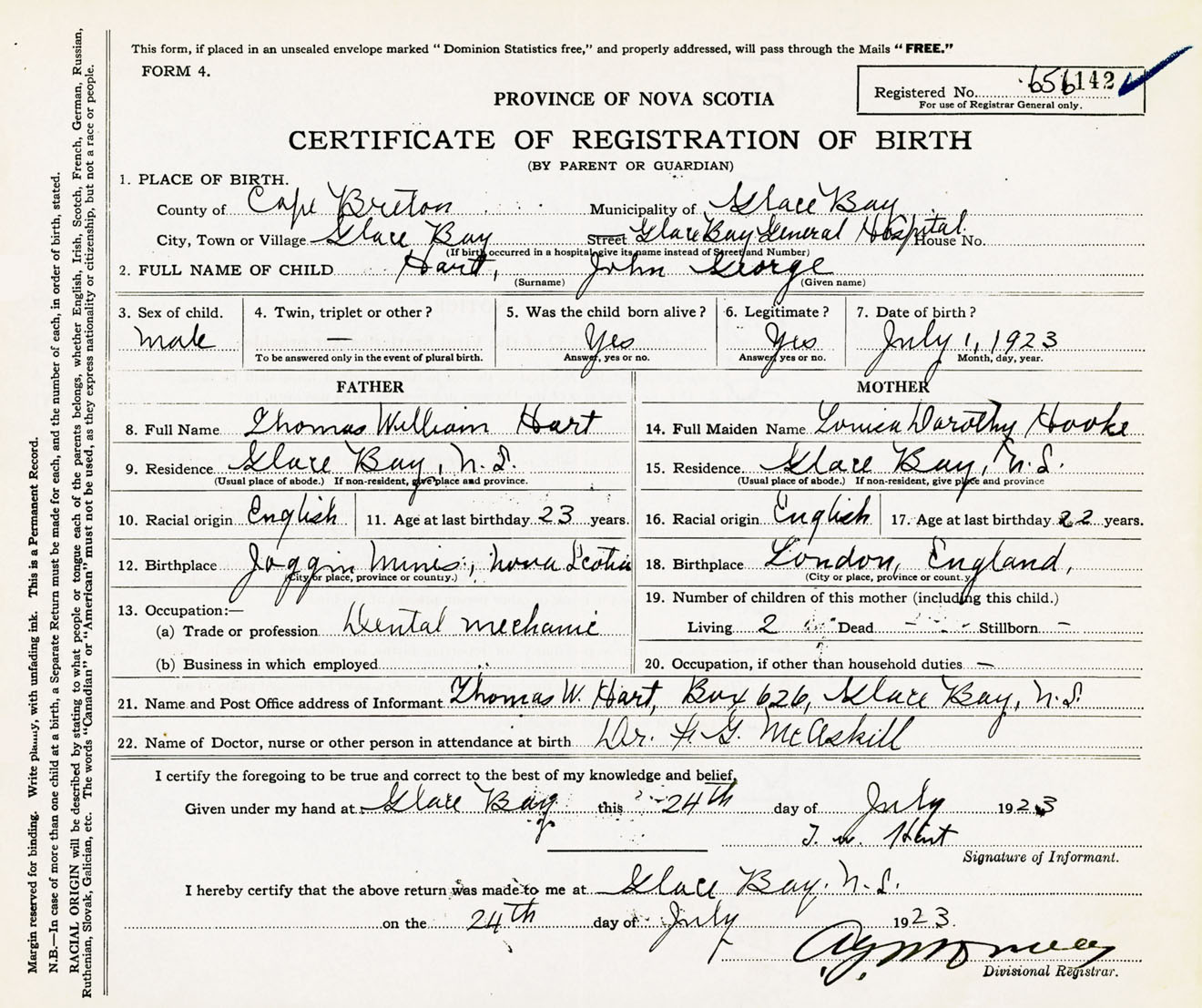 Male Birth Registration: Year: 1923 number: 65600142