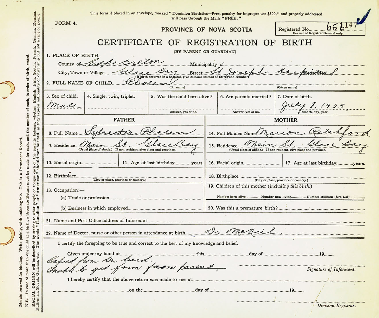Male Birth Registration: Year: 1923 number: 65600147