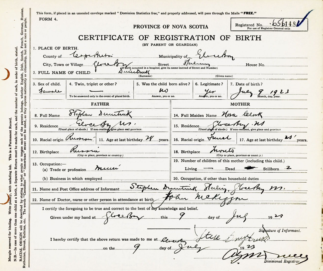 Female Birth Registration: Year: 1923 number: 65600148