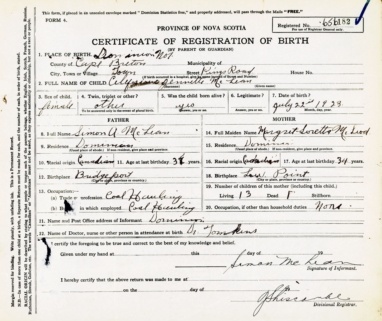 Female Birth Registration: Year: 1923 number: 65600182