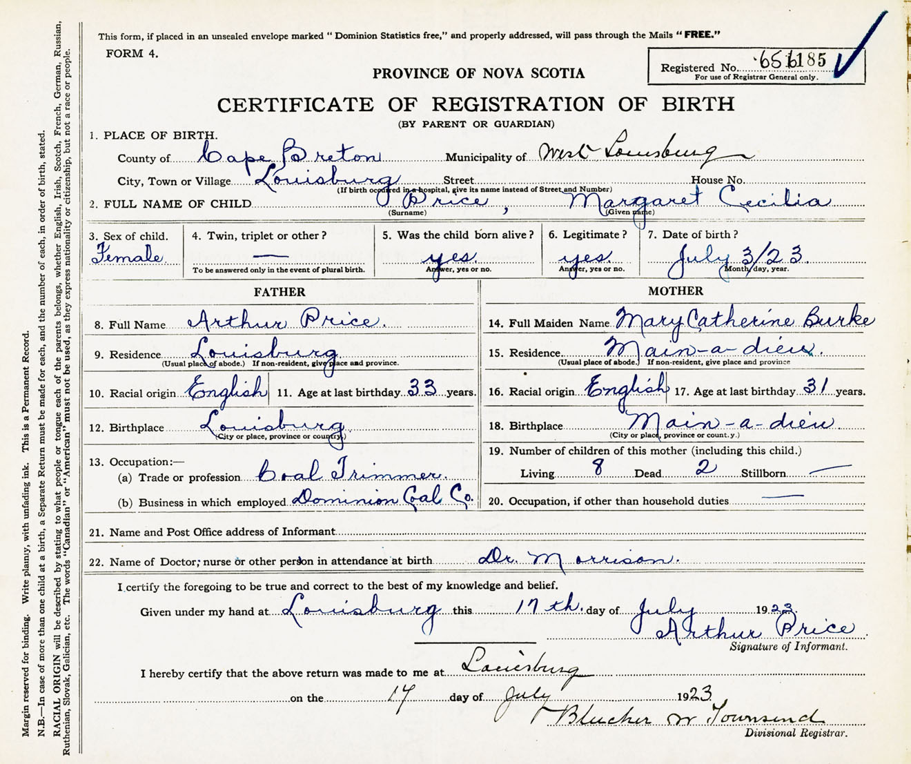 Female Birth Registration: Year: 1923 number: 65600185