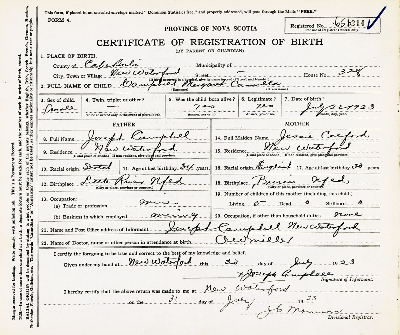 Female Birth Registration: Year: 1923 number: 65600214