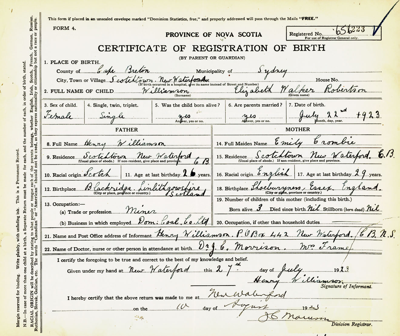 Female Birth Registration: Year: 1923 number: 65600223