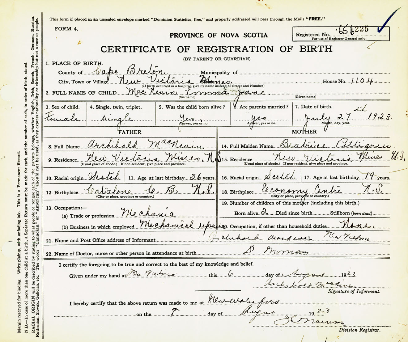 Female Birth Registration: Year: 1923 number: 65600225