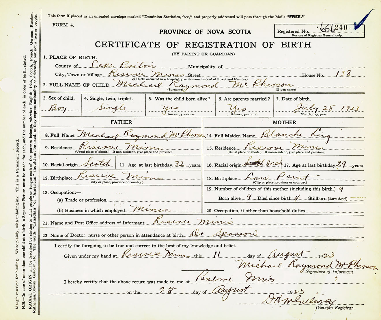 Male Birth Registration: Year: 1923 number: 65600240