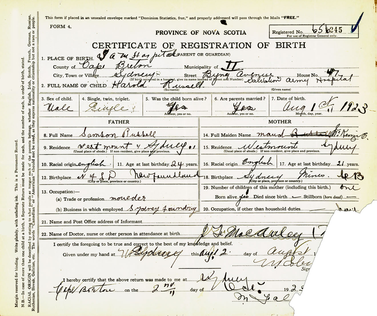 Male Birth Registration: Year: 1923 number: 65600245