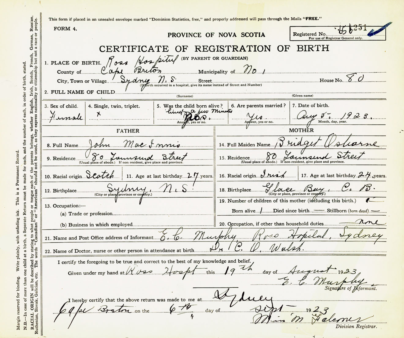 Female Birth Registration: Year: 1923 number: 65600251