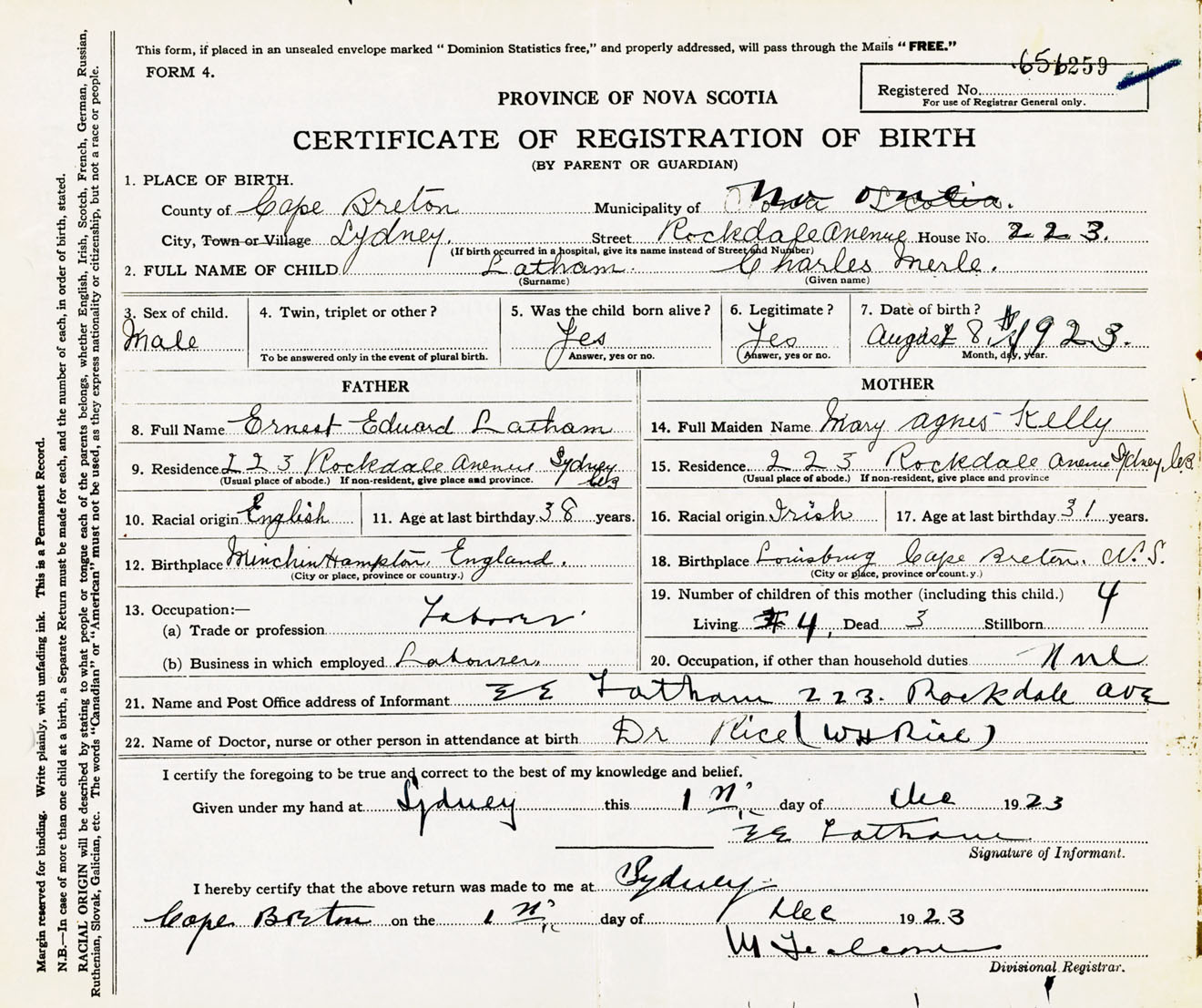 Male Birth Registration: Year: 1923 number: 65600259