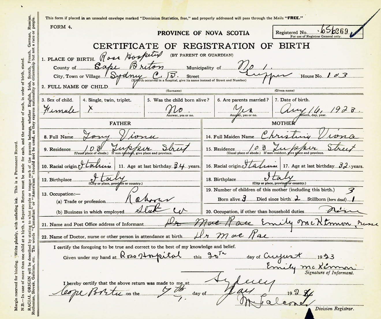 Female Birth Registration: Year: 1923 number: 65600269