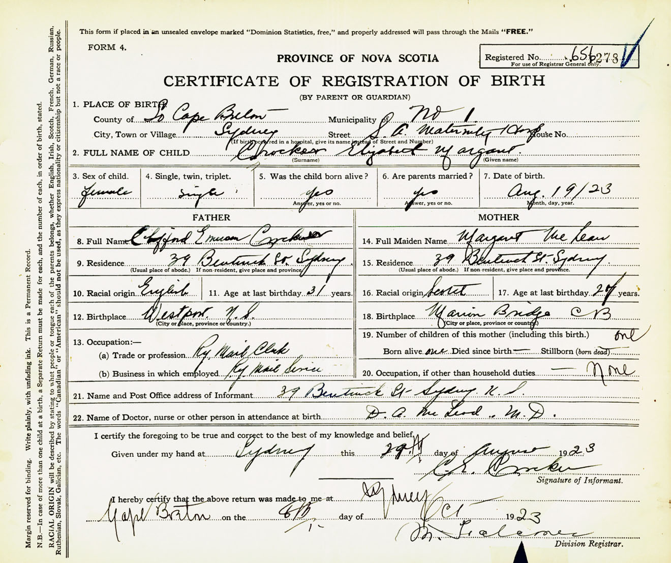 Female Birth Registration: Year: 1923 number: 65600278