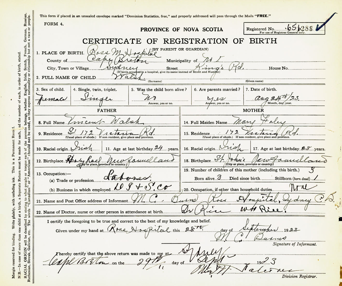 Female Birth Registration: Year: 1923 number: 65600286