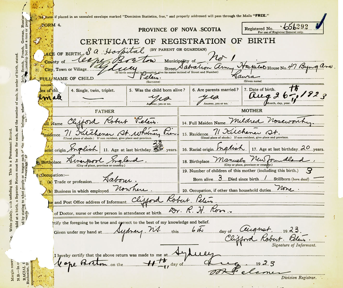 Female Birth Registration: Year: 1923 number: 65600292