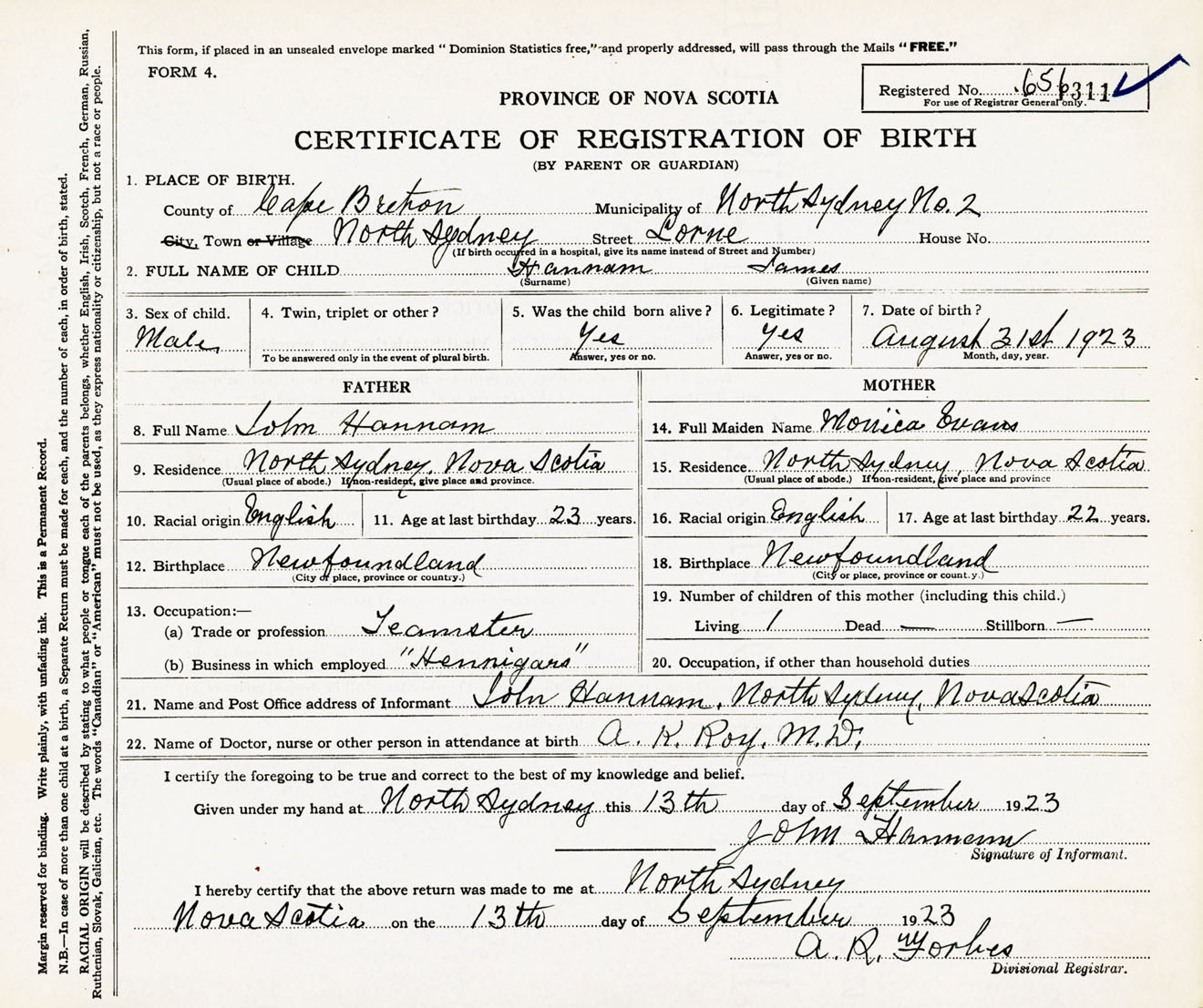 Male Birth Registration: Year: 1923 number: 65600311